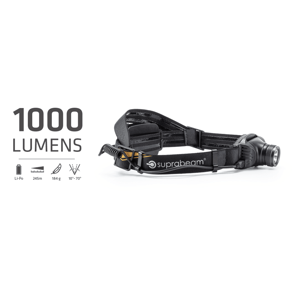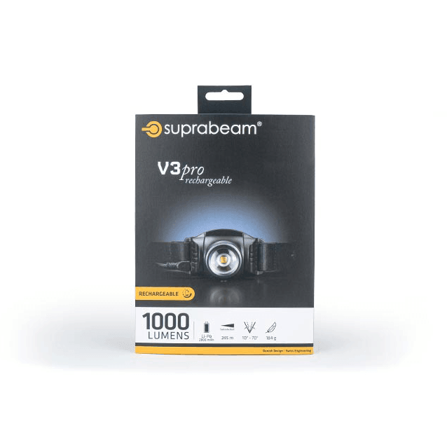 Die wiederaufladbare Suprabeam Stirnlampe V3pro kombiniert mit Ihren max. 1000 Lumen, dem einstellbaren Blickwinkel, einer Brenndauer von max. 8 Stunden (Standard) und einer Leuchtweite von 245 Metern höchste technische Leistung mit perfektem Design. Durch ihren Schiebe-Hyperfokus™ kannst Du durch Schieben des Lampenkopfes zwischen einem runden Flutlicht bis hin zum intensiven Punktlicht für lange Distanzen wählen. Außerdem besitz die Suprabeam V3pro ein rotes Warnlicht, welches an der Rückseite des Batteriepaketes blickt. Geladen wird die Stirnlampe durch ein USB-Kabel, was die Ladung am Computer oder im Auto ermöglicht. Sie ist spritzwasserdicht und super leicht. Das Stirnband kann von der Lampe entfernt und gewaschen werden. Die Suprabeam Stirnlampe V3pro ist somit nicht nur extrem leistungsfähig, sondern auch bequem und für jeden Einsatz optimal geeignet.