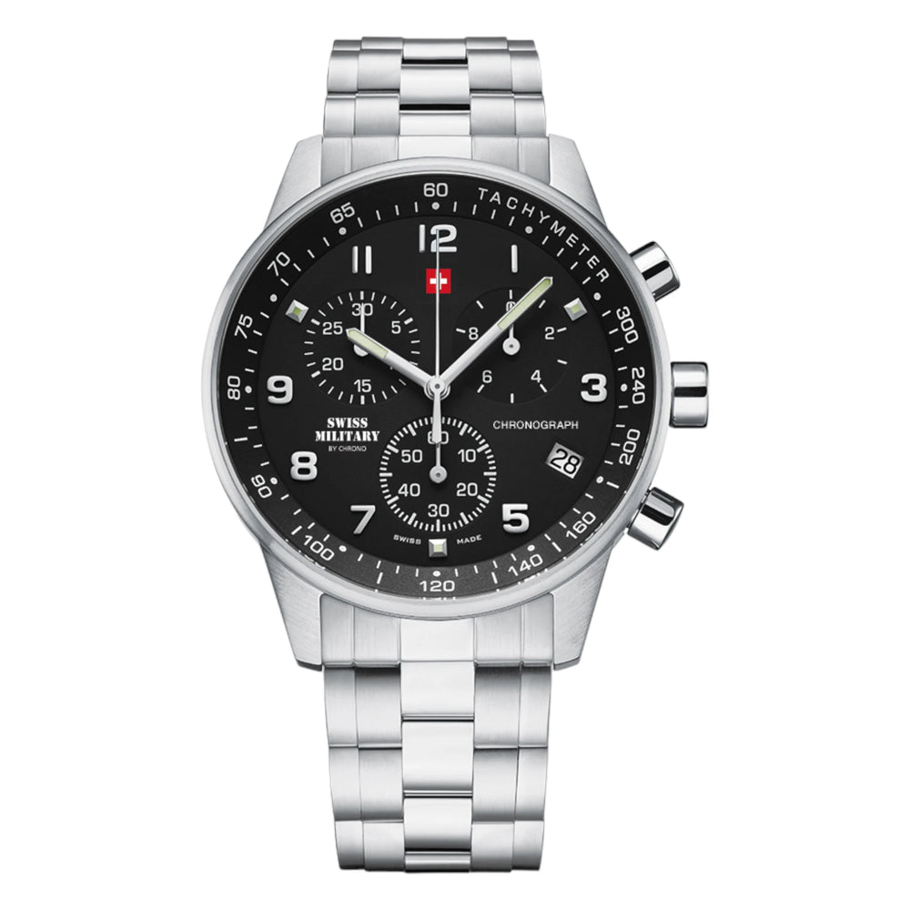 Dieser zeitlose Chronograph im Militärstil verbindet minimalistisches Design mit sportlichen Akzenten. Gehäuse und Armband sind aus robustem Edelstahl gefertigt und verfügen über ein mattes Finish mit glänzenden Details. Das schwarze Zifferblatt ist mit einem Tachymeter und arabischen Ziffern ausgestattet. Extra gehärtetes K1-Mineralglas mit Saphirbeschichtung schützt das Zifferblatt. Die Uhr bietet leuchtende Zeiger und Stundenmarkierungen für gute Lesbarkeit im Dunkeln. Angetrieben von einem Swiss-Made-Uhrwerk, wird diese Uhr in der Schweiz handgefertigt und kommt mit einer 5-Jahres-Garantie.