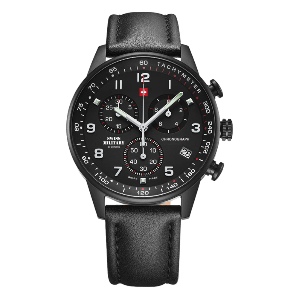 Dieser zeitlose Chronograph im Militärstil vereint minimalistisches Design mit sportlichen Akzenten. Das Gehäuse aus robustem Edelstahl mit mattem schwarzem Finish wird durch ein schwarzes Lederarmband ergänzt. Die schmale Lünette maximiert die Zifferblattöffnung, während das elegante schwarze Zifferblatt mit einem Tachymeter und arabischen Ziffern versehen ist. Extra gehärtetes K1-Mineralglas mit Saphirbeschichtung schützt das Zifferblatt. Leuchtende Zeiger und Stundenmarkierungen sorgen für optimale Lesbarkeit im Dunkeln. Der Chronograph, angetrieben von einem Swiss-Made-Uhrwerk, wird in der Schweiz handgefertigt und hat eine internationale 5-Jahres-Garantie.