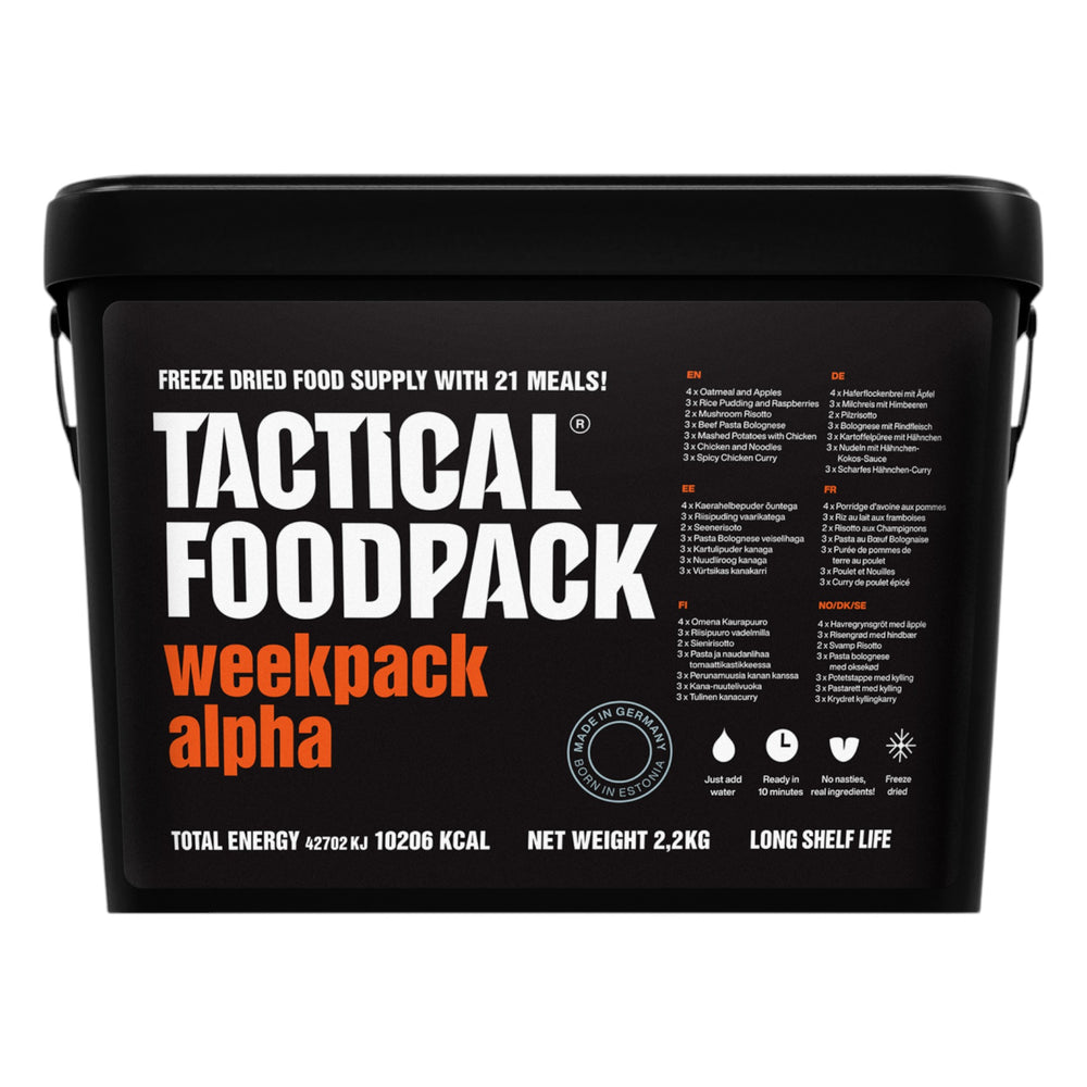 Das Tactical Foodpack Weekpack Alpha ist die ideale Lösung für eine komplette Woche autarker Ernährung. Enthalten sind 21 Tactical Foodpack Mahlzeiten, die durch Gefriertrocknung lange haltbar sind. Die Gerichte sind einfach mit heissem Wasser zuzubereiten – perfekt für Outdoor-Abenteuer, Notvorräte oder längere Expeditionen. Dank des kompakten Formats bleibt das Pack leicht transportierbar. Die ausgewogene Zusammenstellung sorgt für eine hohe Energiezufuhr mit insgesamt 10'206 kcal. Entwickelt für extreme Bedingungen, lagerfähig von -10 °C bis +30 °C.