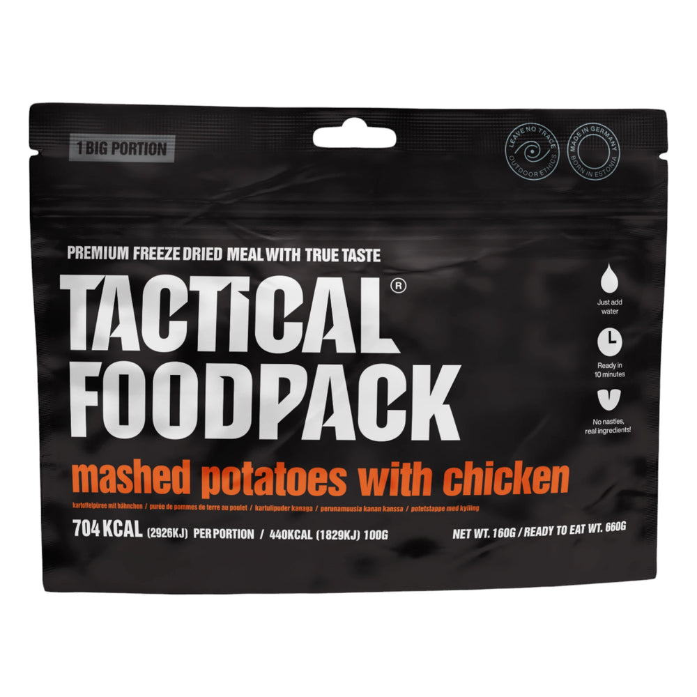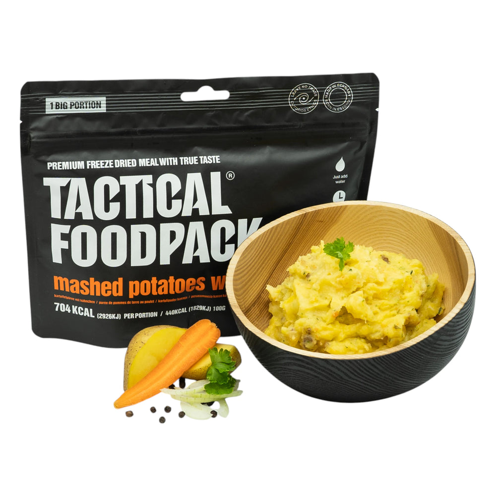 Ein einfaches, aber herzhaftes Gericht, das Komfort und Energie spendet: Cremiges Kartoffelpüree mit zartem Poulet. Mit echter Butter zubereitet, erhält das Püree eine besonders glatte Textur und reichhaltigen Geschmack. Frisches Gemüse wie Karotten und Zwiebeln ergänzt die Mahlzeit, während Petersilie den Geschmack perfekt abrundet. Ideal für Outdoor-Abenteuer oder als schnelle, nahrhafte Mahlzeit für zwischendurch. Die grosse Portion sorgt für ausreichend Energie und Genuss, egal wo du bist.