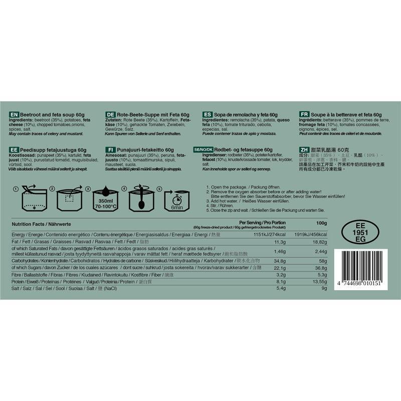 Eine ausgewogene und vollwertige Ernährung nach für eine hochintensive Outdoor-Aktivität: die Tactical Foodpack Outdoornahrung sorgen für den nötigen Energieschub den Du brauchst und das mit überraschend vielfältigem Geschmack. Farbenfrohe und gesunde Rote-Bete-Püreesuppe, mit Fetakäse als geschmackliche Ergänzung.